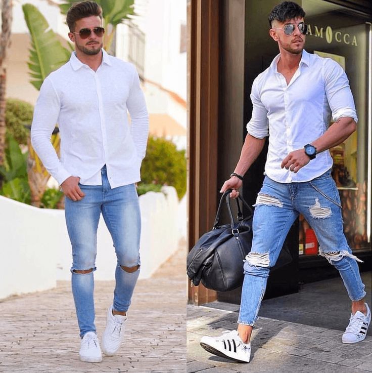- В свободном стиле удачно будут выглядеть светлые джинсы, футболка поло в полоску или однотонная и светлые спортивные туфли