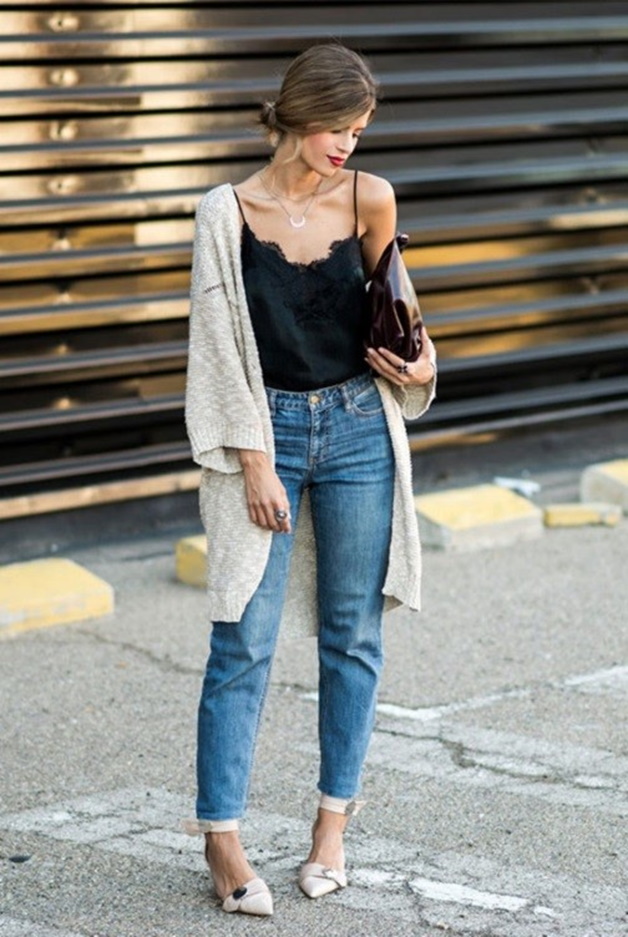 А вот если добавить легкую блузку, заправленную в джинсы, и накинуть поверх нее кардиган без рукавов, вы создадите стильный лук, подходящий для работы и прогулок.