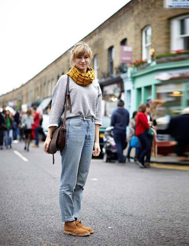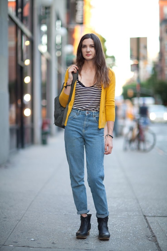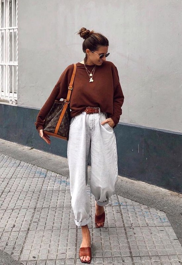 «Мамины» джинсы хороши для создания повседневного лука. С ними отлично сочетаются свитеры и пуловеры. Они должны быть укороченными или заправленными. Кофта ни в коем случае не должна закрывать линию талии. В противном случае можно получить бесформенный и неопрятный вид.