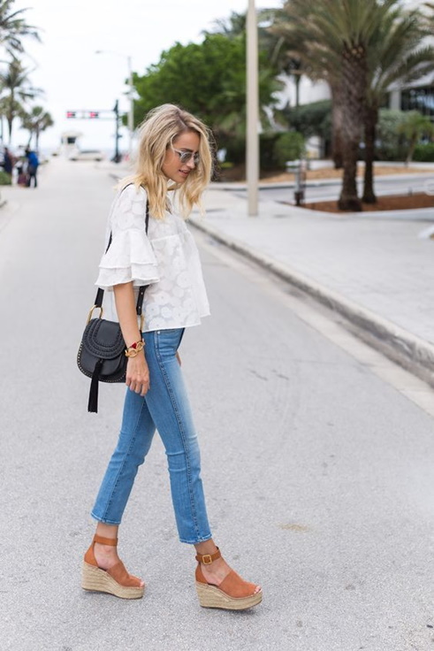 К босоножкам на танкетке можно подобрать бойфренды, белую кофту или блузку. Если у джинсов высокая талия, идеально будет смотреться боди.