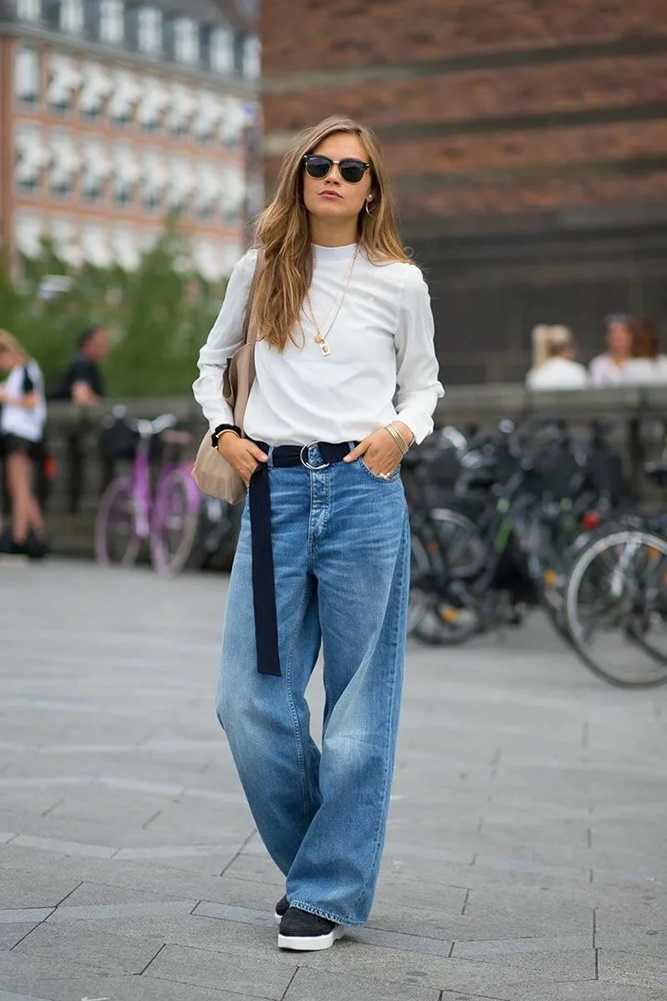 Широкие джинсы – достаточно сильный акцент, поэтому желательно подбирать к ним спокойный топ.