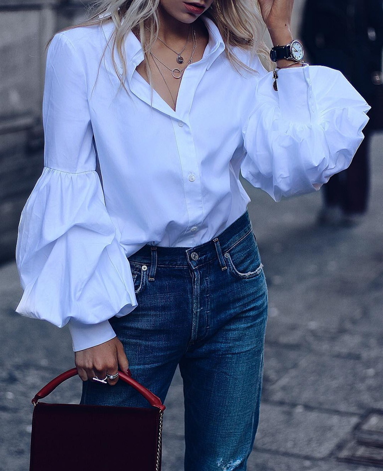 Бананы (впрочем, как и любые другие джинсы) идеально сочетаются с белым верхом. Это может быть топ, рубашка, блузка, свитер и пр. В паре с кардиганом или пиджаком получится стильный лук, уместный как для прогулок и свиданий, так и для офиса.