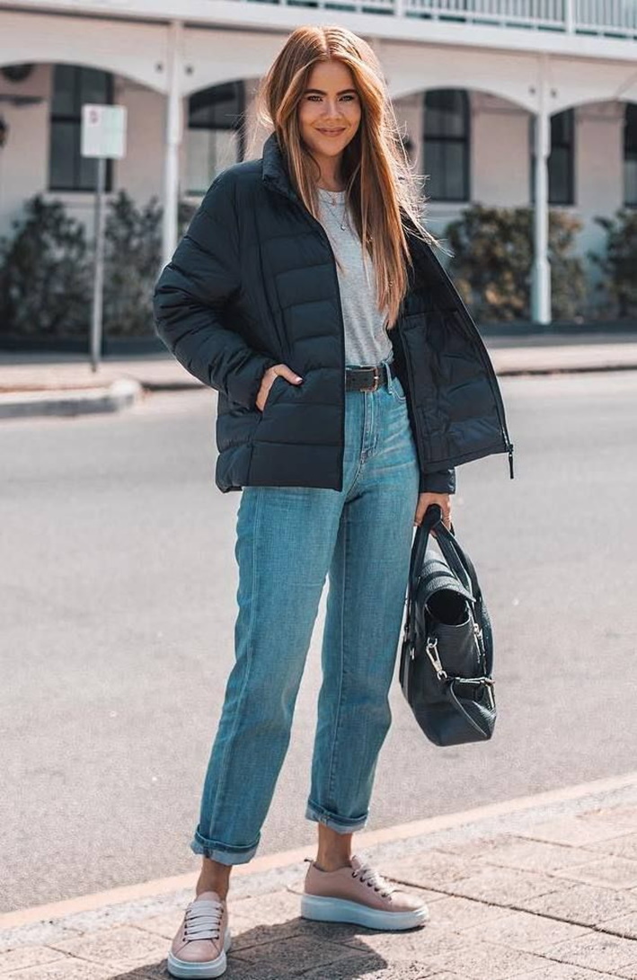 Бойфренды хорошо смотрятся в паре с пальто, паркой, а также пуховиком мини или средней длины.