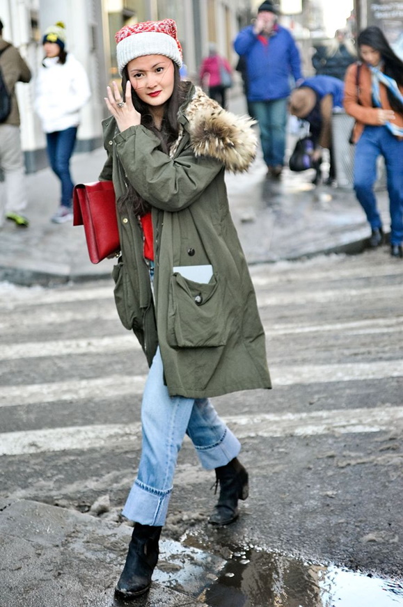 В зимние холода джинсы-бананы можно носить с полушубком, теплым манто, дутой курткой или дубленкой. На ногах будут уместны угги, ботильоны или ботинки. Тепло и удобно.