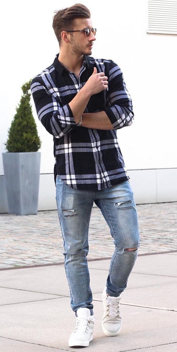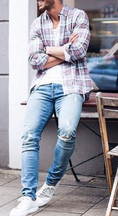 Мужчины любят носить джинсы с рубашками в клетку, но рубашка в клетку не должна быть тонкой, короткой.