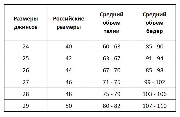 | Обозначение на джинсах (W) | Соответствие российскому размеру |