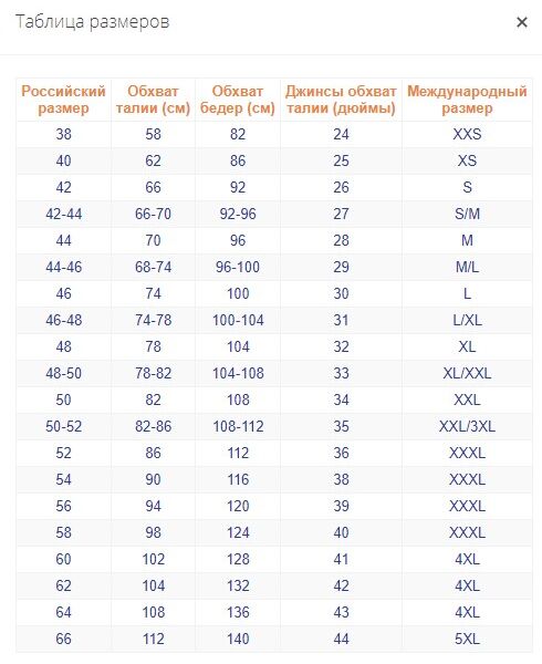 (талия) — 52(Российский размер) W38 — 97см.(талия) — 54(Российский размер)
