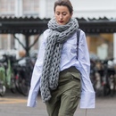 - Объемный шарф молочного цвета из крупной пряжи, обмотанный вокруг шеи, придает образу трогательную хрупкость и стильно сочетается с кожаной курткой и джинсами.