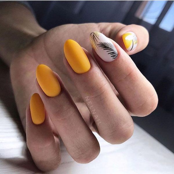 В качестве узора для такого маникюра можно выбрать кусочки фольги, роспись, рисунки, выполненные гель-лаком теплых тонов.