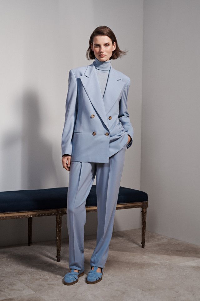 Костюмы отличались узкими брюками и гладкими силуэтами.