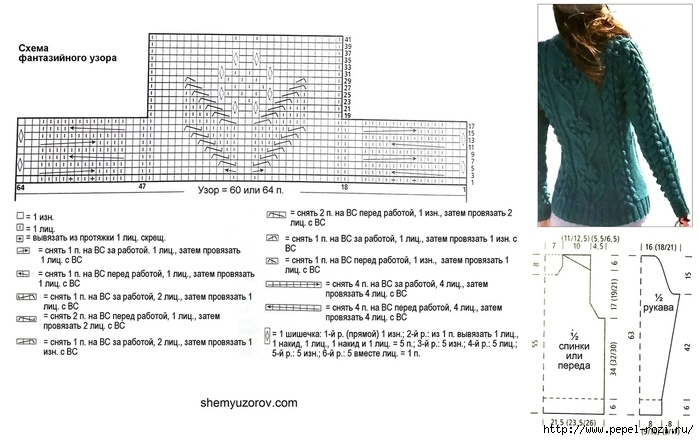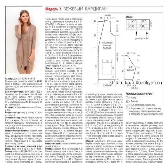 Этот узор для вязания кардигана реглан вяжется сверху вниз лицевой гладью. Модель имеет рукав реглан и облегающий свободный крой.