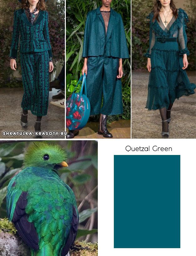 Особое внимание современных модельеров в этом сезоне уделено оттенку Quetzal Green. Это цвет пера пташки Центральной Америки. Переводится как зеленый кетцаль. Насыщенный, яркий колер подходит голубоглазым блондинкам, подчеркивая глубину из глаз. Кетцаль Грин прекрасно сочетается с классическими тонами.