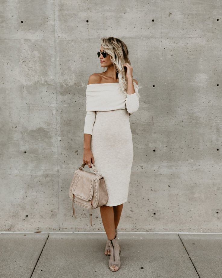 Белое вязаное платье, по мнению известных дизайнеров, является самым удачным зимним нарядом на все времена. Благородный белый цвет прощает грубость вязки, ошибки в выборе узоров и украшений. Комбинировать такой наряд стоит с черными, серыми, синими или темно-зелеными колготками, большой сумкой и верхней одеждой любого формата.