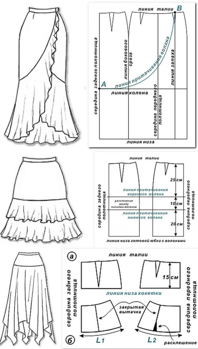 В этой статье мы рассмотрим безлекальный раскрой нескольких простых юбок для начинающих на основе «татьянки» и «солнца» с перепадом длины.