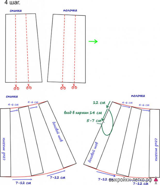 После этого вырезаем вторую половину юбки, обведённую на рис. 5 синим цветом.