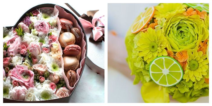 - В последнее время часто встречаются цветы в коробке с лакомствами, например, с макарунами. Смотрится безумно стильно и красиво.