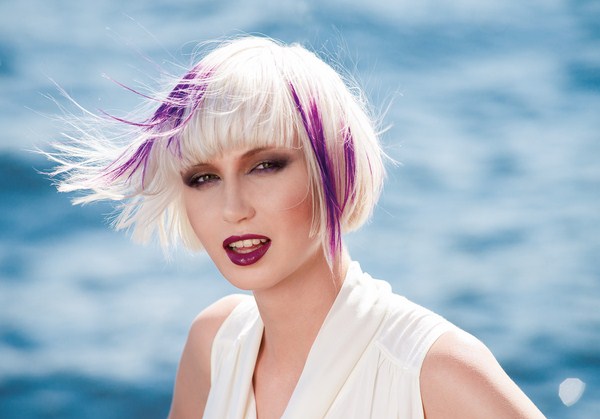 - контрастные пряди – мода на футуризм привела к появлению тренда на необычные «космические» укладки и броские решения в окрашивании волос. На темных волосах следует делать акценты при помощи фиолетовых, лиловых и винных прядей, а на светлых волосах — использовать голубые, зеленые и персиковые. Основой для такого колористического решения должен стать боб с резкими переходами длины или пикси;