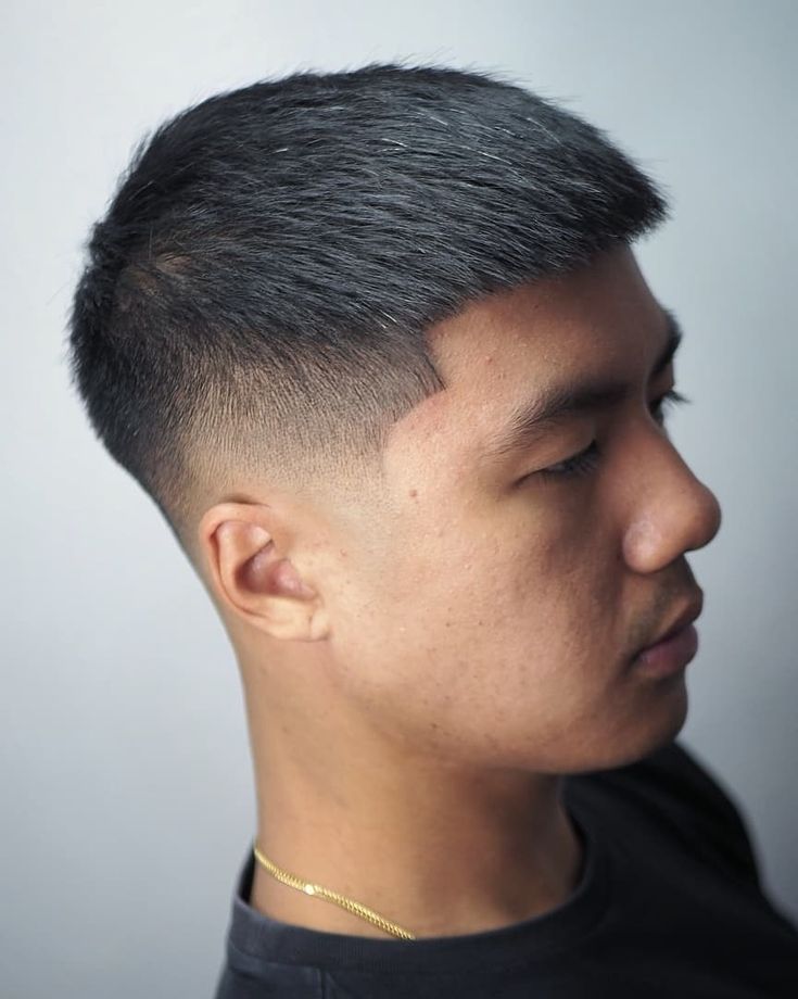 Для дополнения короткой азиатской стрижки мужской фейд — идеальный вариант. Это позволяет создать контраст с уже короткой верхней частью, так что в итоге вы получите ярко выраженный и привлекающий внимание вид волос.