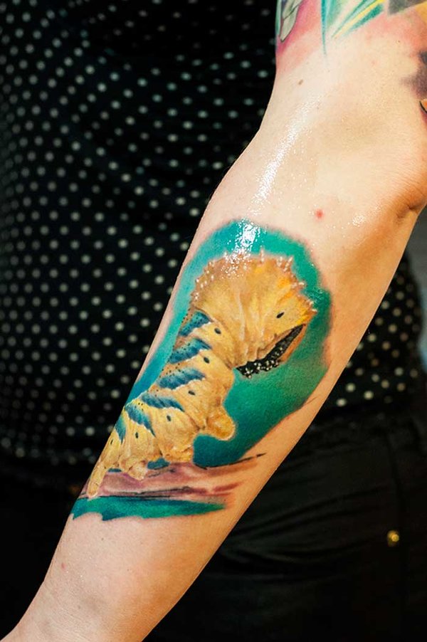 - Исполнение такой татуировки подразумевает акцентирование на яркости, с использованием самых разнообразных оттенков. Выбирая цветное тату, желательно избегать картинок и сюжетов, имеющих излишне мелкие детали. Данный вариант больше подойдет для создания масштабных картин.