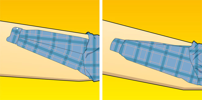 На нижнем рисунке показан шов рукава рубашки – используйте его в качестве ориентира при плоской укладке рукава.