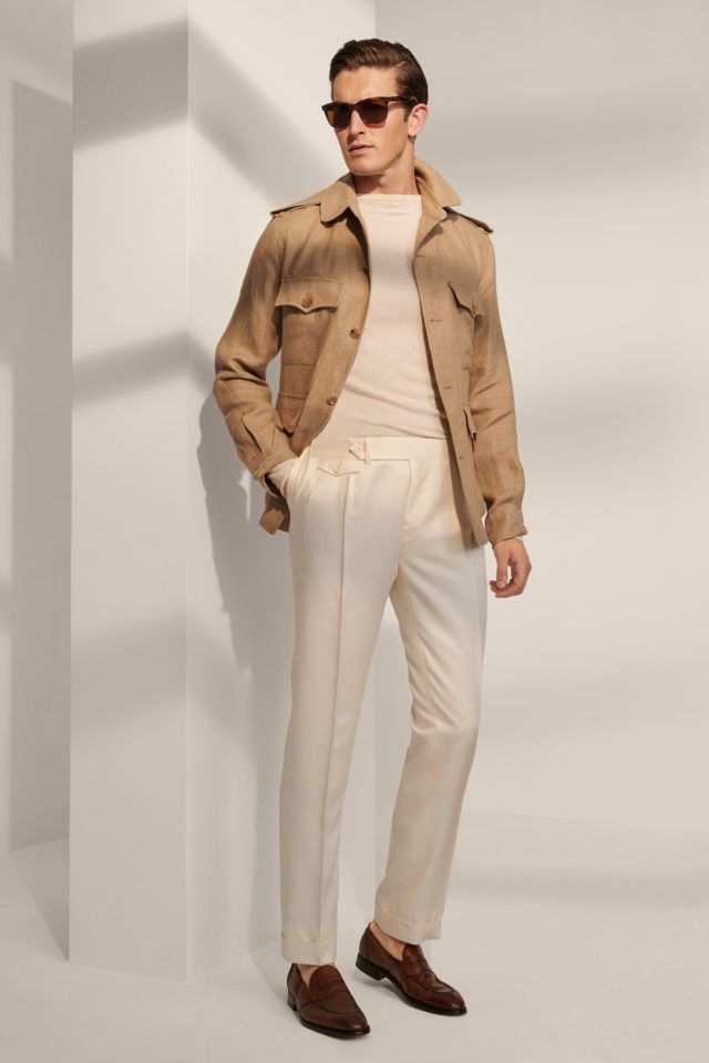 Летний вариант мужского костюма может быть изготовлен из легких тканей типа лен.