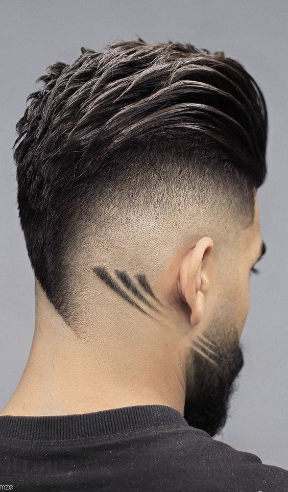 Это мощный и привлекающий внимание стиль для молодых мужчин. Кроме того, это очень характерная прическа, характеризующаяся длинными волосами сверху и короткими по бокам. Через одну сторону головы проходит несколько строк, напоминающих хэштег (например, #). Вы также можете стилизовать его в стиле помпадур.