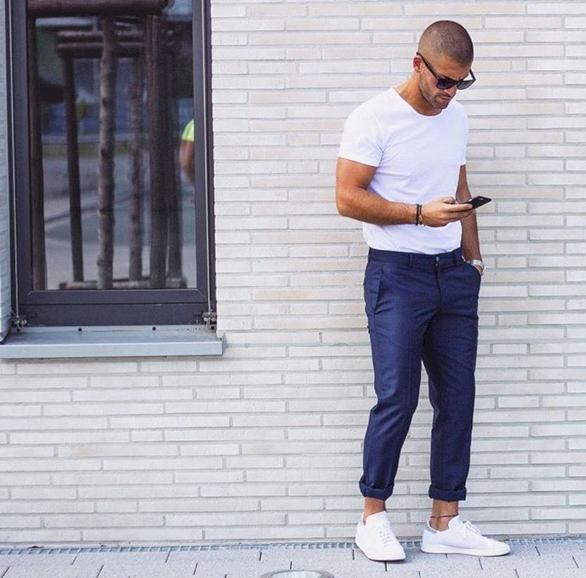 Беспроигрышный вариант – обувь в тон штанам, и это касается не только классических брюк. Некоторые стилисты, напротив, что не стоит подбирать кроссовки в тон брюкам. По их мнению, это правило работает только к паре: белая футболка, белые кроссовки. Это идеальное сочетание, которое работает всегда.