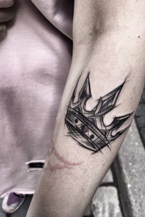 Источник: @34inkredibletattoo через Instagram Маленькие цветные татуировки могут выглядеть очень ярко и мило. Татуировка короны, показанная выше, нанесена на верхнюю часть руки мужчины.