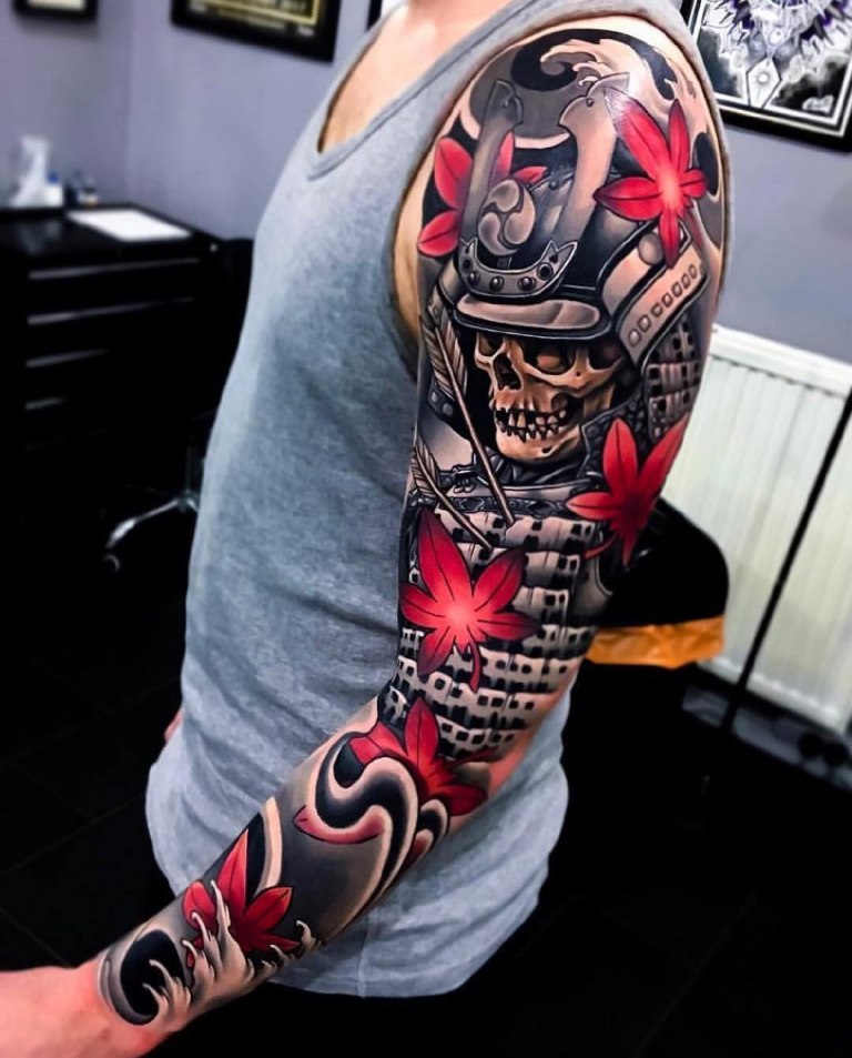 - Японские традиционные тату (ирезуми). В Стране Восходящего Солнца мужские татуировки вошли в моду в XVII веке среди аристократии. Это были утонченные рисунки – настоящие художественные шедевры. Изображения располагаются так, что поверхность кожи полностью закрыта узорами, сплетающимися в один. Он выполняется толстыми линиями, используются только основные цвета.