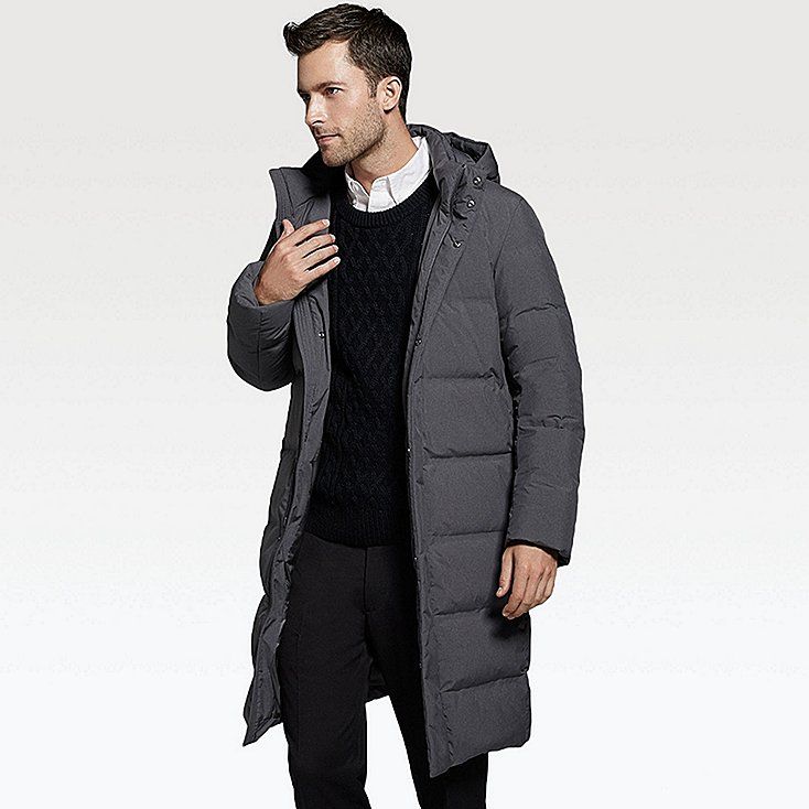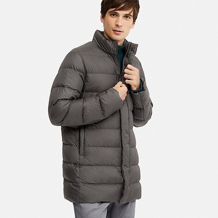 Uniqlo Мужское бесшовное пуховое пальто (длина от ворота до низа 93см, ширина 140см), новое с биркой, цвет серый, трикотажные манжеты внутри, карманы наружные на замке и внутренние, капюшон отстегивается. Элегантная и практичная модель.