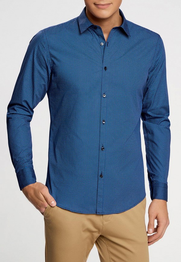 Мужская классическая приталенная рубашка с пуговицами отложным воротником и длинным рукавом темно синяя