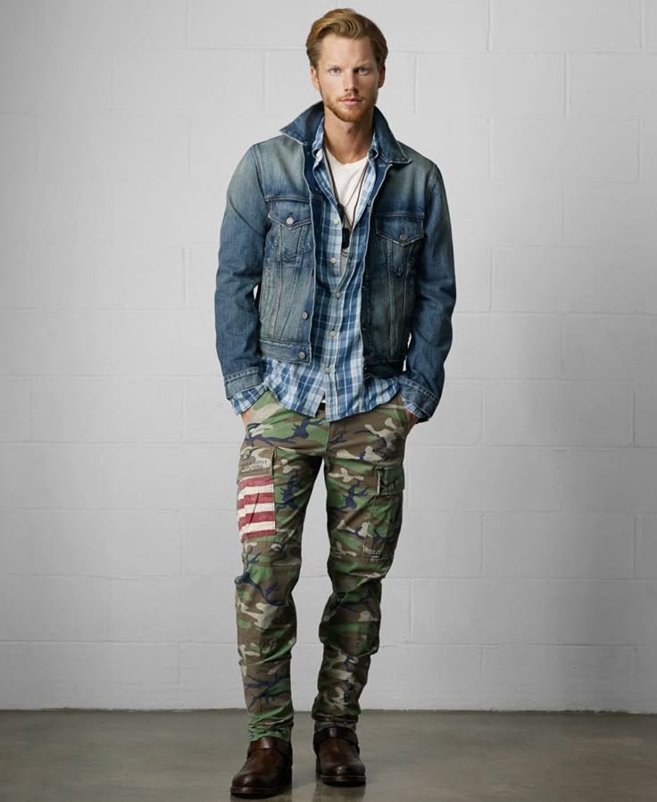 Стиль как нельзя лучше подчеркнут штаны с камуфляжным принтом, брюки-карго и чиносы армейских расцветок. Брюки целесообразно дополнить военным ремнем.