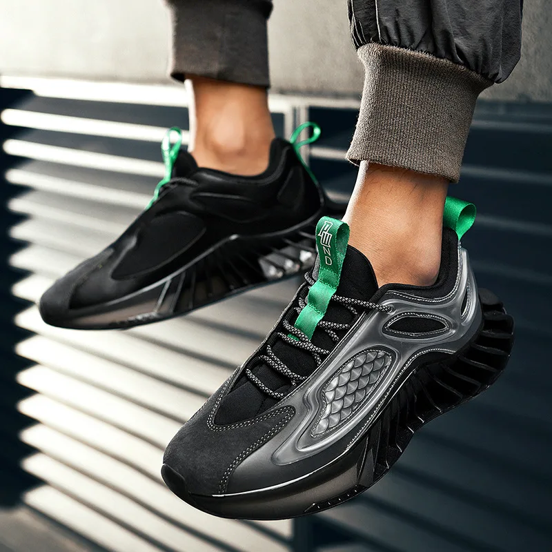 Брутальные кроссовки представлены в разнообразных фасонах и текстурах, неизменно одно: чёрные кроссовки легко вписать в любой образ, включая деловой костюм.