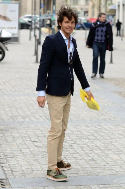 Вариант с синими брюками и туфлями бежевого цвета – для самых уверенных в себе. Такое сочетание выдаст в вас настоящего стилягу.