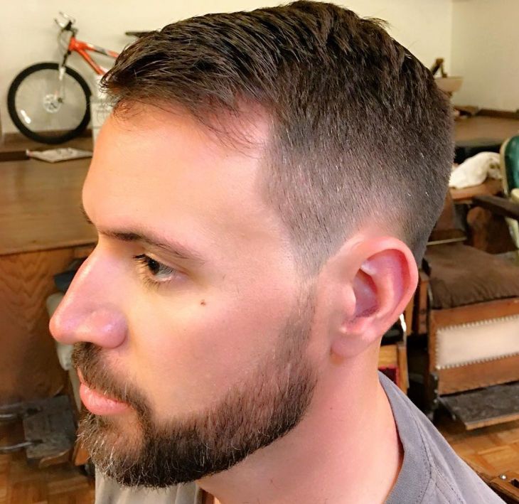 Стрижка «кустик» с низким эффектом фейда популярна среди мужчин, которые хотят носить волосы как можно короче. С ним не только легче работать (почти не нужно расчесывать, расчесывать или использовать какие-либо средства — буквально вставай и иди), но он также работает со всеми текстурами волос. Добавьте усы и эспаньолку (которая снята с производства) и сделайте ее своей. Отлично смотрится с квадратной или овальной формой лица.