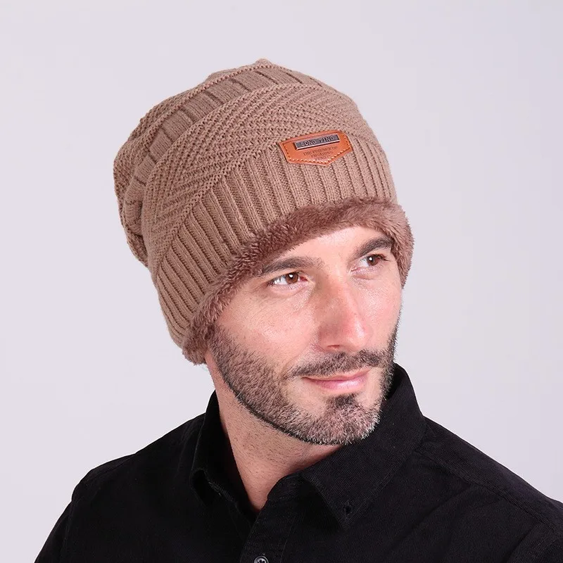 Шапка с широким отворотом фактурной вязки или с необычным орнаментом не будет оспаривать мужественность своего хозяина, даже если натянуть ее до бровей и полностью закрыть мочки ушей.