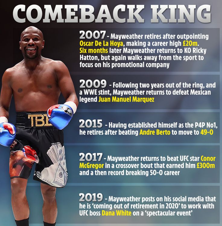 Бывший король весовой категории и чемпион мира в пяти весовых категориях Флойд Мейвезер-младший сделал официальное заявление в социальных сетях в среду, подтвердив, что он выйдет из 23-месячной пенсии в возрасте 40 лет, чтобы встретиться с Конором МакГрегором, суперзвездой UFC. , в боксерском поединке 26 августа в Лас-Вегасе.