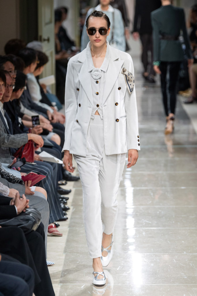 “ Мужское и женское движутся параллельными путями. Стиль обретает форму в воздушной, но неподвижной консистенции шелковистых матовых тканей деконструированных женских блейзеров, в то время как в их мужском варианте струящиеся костюмы определяют тело. Длинные тренчи имеют прямые линии. Городской кодекс приобретает активное и действенное измерение благодаря разнообразию тканей и их комбинаций. Спортивные перекрестные загрязнения присутствуют в мужских виниловых шортах-бермудах и соответствующей куртке, в кроссовках из кожи и тюля и в компактных рюкзаках, которые носят с длинными платьями. Цветовое путешествие движется от нейтральных, пыльных тонов песка, мела, бежевого, пастельно-розового, земляного и каменно-серого до диапазона синих, от темно-синего до джинсового, с акцентами из люрекса для женщин.