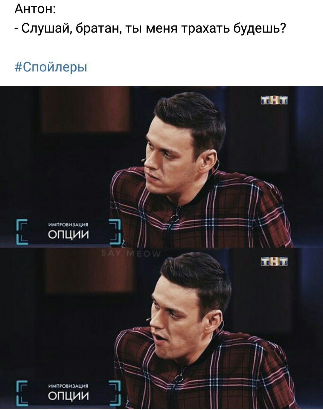 Антон Шастун: В шоу «Импровизация» действительно нет никакого сценария, единственное, что заранее заготавливается, – это темы, которые нам предлагает Паша Воля. В нашей передаче кроме четырёх актёров и Павла как ведущего есть креативная группа. Это группа авторов придумывает темы для шоу. Естественно, все это готовится без нас, да и вообще мы очень редко видимся с креативной группой. Потом придуманные темы Паша даёт нам, иногда меняя что-то на ходу. Мы ничего заранее не придумываем, и заготовленного юмора у нас нет. Все по-честному.