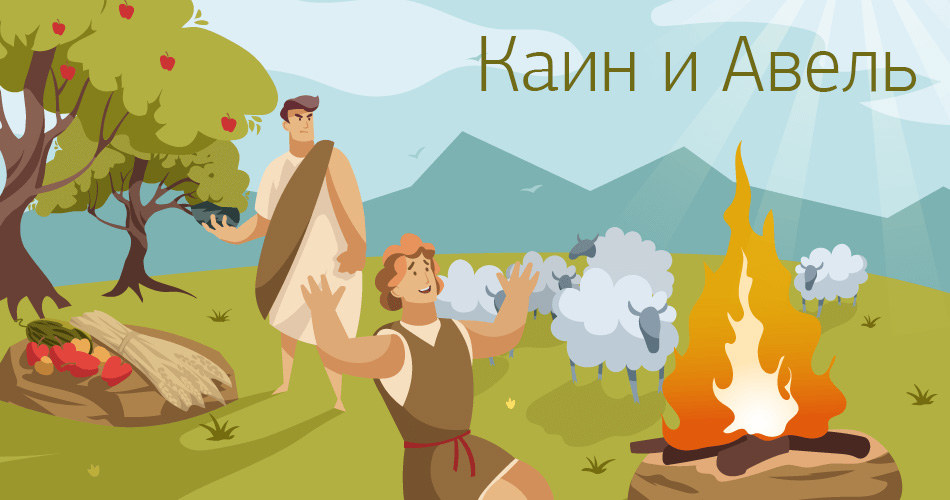 Каин-земледелец и Авель-скотовод приносили плоды трудов своих в жертву Богу. Бог благосклонно принимал жертву Авеля, так как приносилась она с чистым сердцем. Жертва Каина была отвергнута, так как Каин приносил жертву лишь по привычке, без любви к Богу. Из зависти и гнева Каин убивает Авеля, совершая тем самым первое преступление на юной Земле.