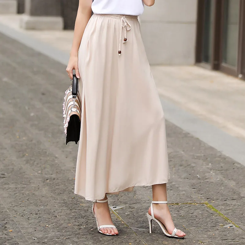 Длинная бежевая юбка, независимо от фактуры материала, создает эффект легкости и безмятежности. Фасону макси в нейтральном цвете составляют выигрышную компанию яркие топы, майки в пастельных оттенках или приталенные блузки созвучной гаммы. Интересное дополнение к модели нюд в пол – укороченный жакет яркого или же спокойного дизайна.
