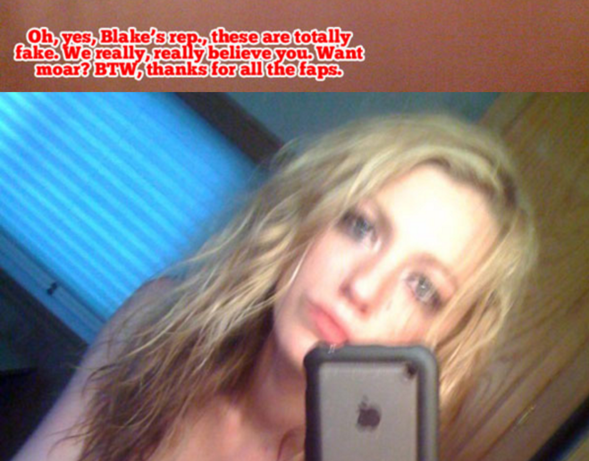 Люди Блейка непреклонны… сообщают TMZ, что человек на фото не Блейк. Опровержение, по-видимому, спровоцировало хакера, опубликовавшего новые фотографии, таким предупреждением: «О, да, представитель Блейка. Это полная подделка. Мы действительно, действительно вам верим. (К вашему сведению: «faps» — это ссылка на получение удовольствия)