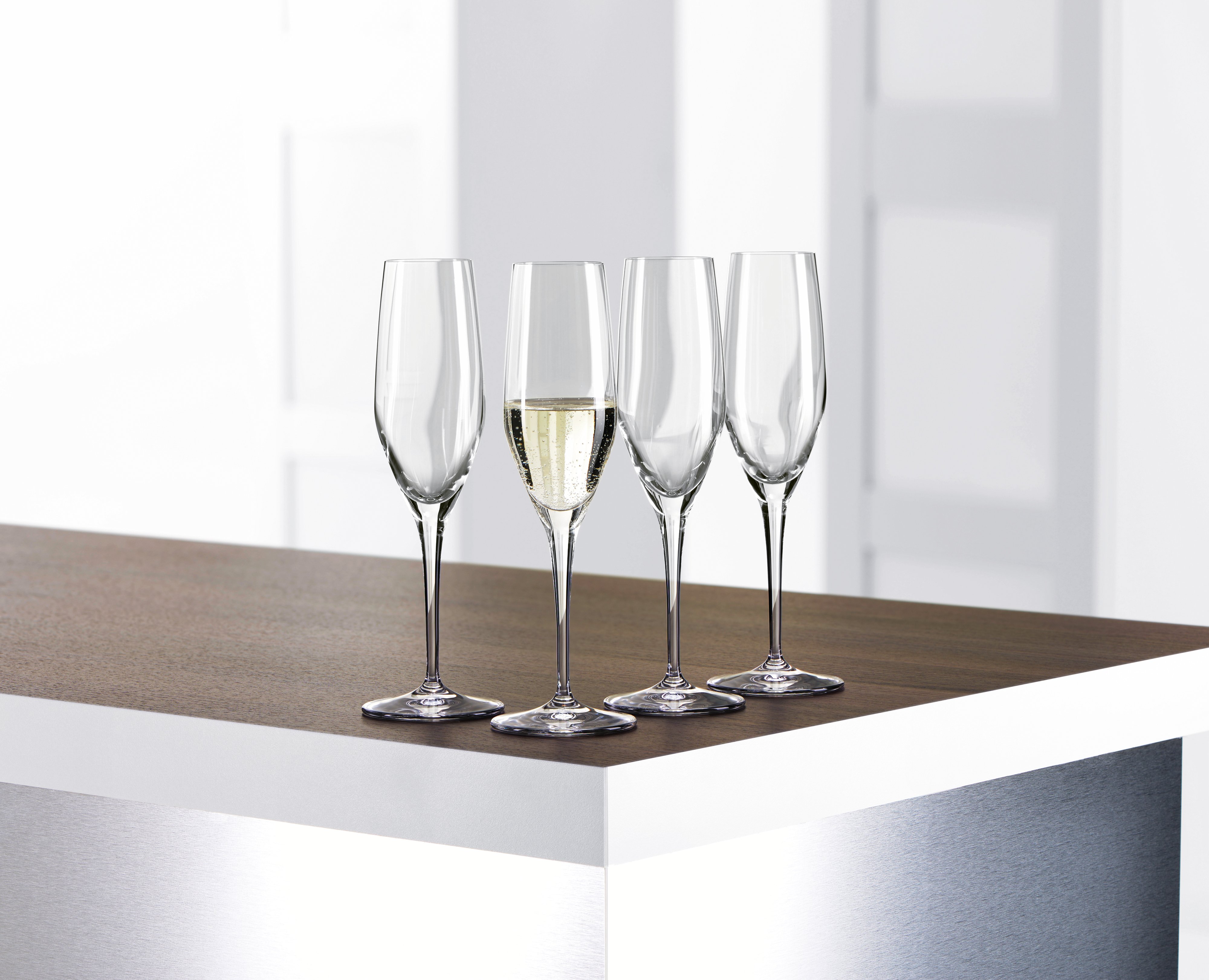 Если вы ищете золотую середину, то бокал «купе» или бокал для шампанского в форме тюльпана позволят пузырькам играть немного дольше, чем обычный винный бокал, который, в свою очередь, позволит выйти на первый план интенсивной ароматике.