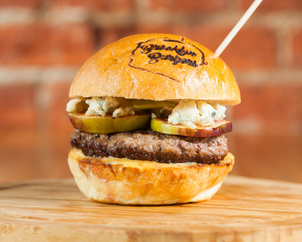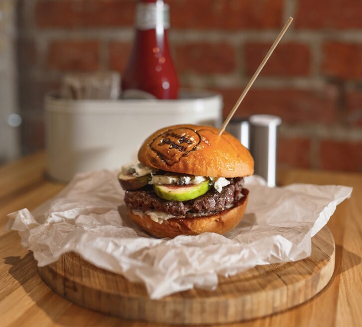 Например, бургер с говяжьей котлетой, глазуньей, луком фри, каперсами, беконом и пикантным соусом из печеных яблок. Или бургер со свекольно-яблочным чатни, говяжьей котлетой, моцареллой, малиновым соусом и крошкой из изюма и мяты.
