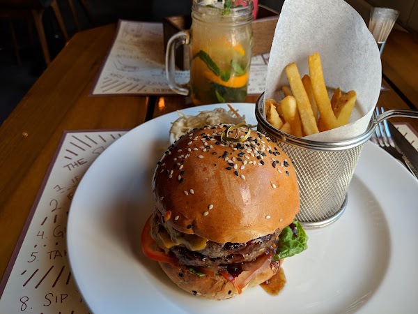 Готовят здесь ровную бургерную классику: с пышной говяжьей котлетой, обильными соусами, зеленью, овощами и сыром. Можно заказать бургер с куриной котлетой или фалафелем, заменить булочки салатными листьями или выбрать что-то другое — например, стейки и куриные крылышки.