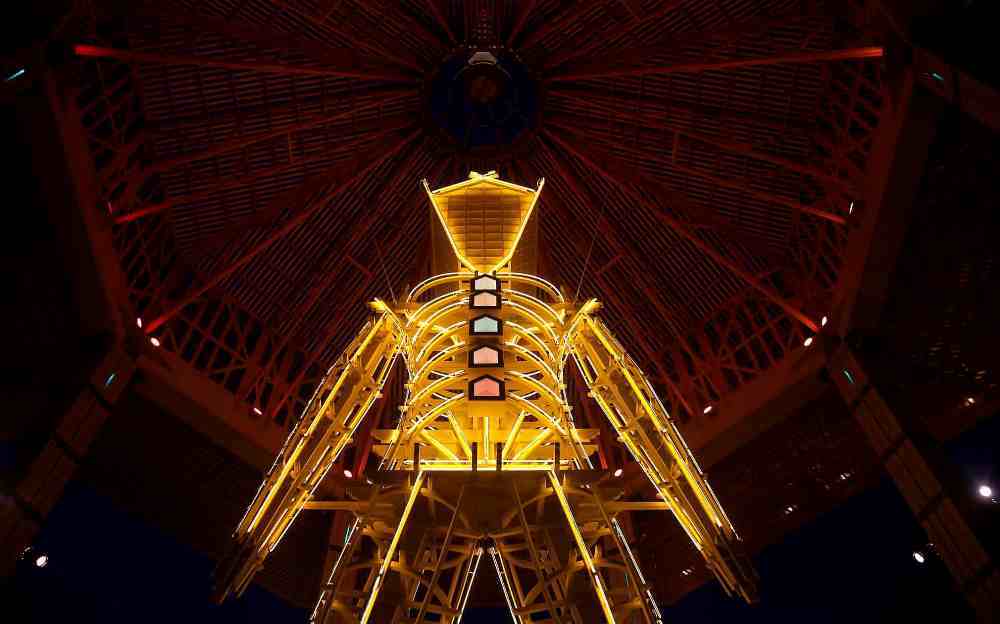 На шестой день в вечернее время возле этой статуи собираются почти все посетители фестиваля. Первым идет Fire Show, потом фейерверки, после чего сооружение подпаливают. Статуя подымает руки и падает.