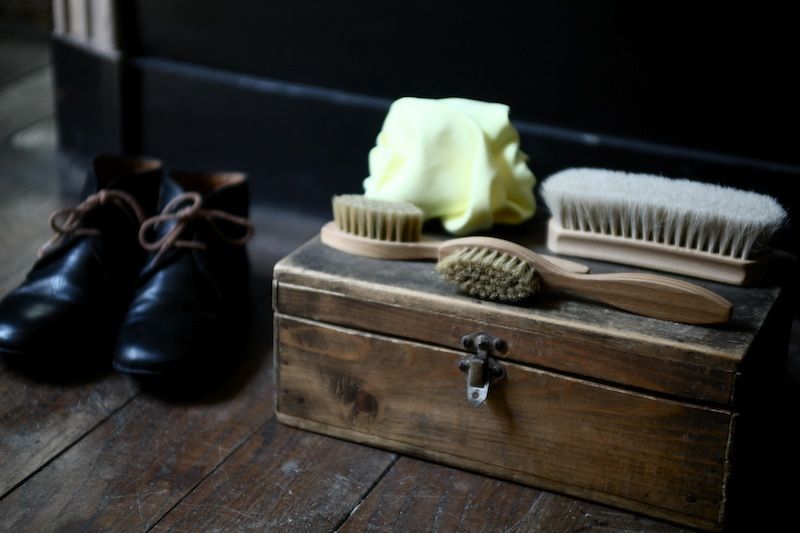 *Набор для ухода за обувью: с щетками для полировки или чистки замши, маленькими щетками для нанесения крема, ложкой для обуви, кремами и тряпочкой для финальной полировки. *