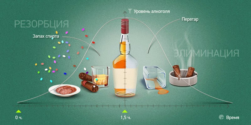 Алкоголь примерно покидает организм со средней скоростью 0,015 грамма на 100 миллилитров в час. Это означает снижение уровня BAC человека на 0,015 в час.