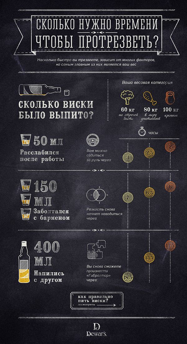 Печени требуется около часа, чтобы расщепить от половины до одного напитка. Таким образом, если выпить одну бутылку пива, то алкоголь выведется из организма не ранее чем через два часа [2]. Если увеличить дозу до восьми порций за короткий интервал в три часа, то потребуется уже около 13 часов, чтобы протрезветь окончательно.