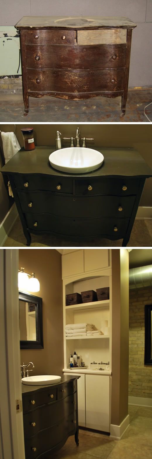 Верхушку комода нужно защитить от влаги при помощи самоклейки, сделать в ней прорезь под раковину, а внутри комода оборудовать систему подачи и отвода воды.